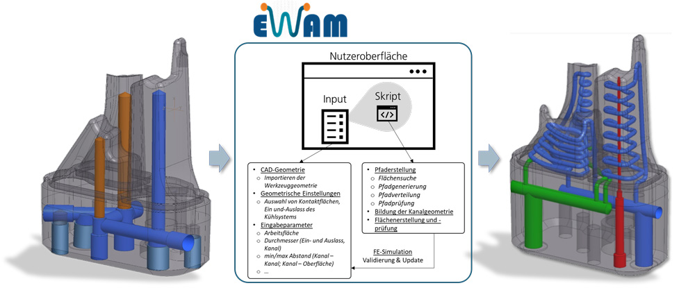 Im Projekt soll eine skriptbasierte, automatische Temperierkanalkonstruktion entwickelt werden. Ziel ist es, die Effizienz bei der Konstruktion von additiven Formwerkzeugen zu steigern, indem der manuelle Aufwand reduziert, die Gestaltungsfreiheit erhöht und die Temperierleistung gegen über dem Stand der Technik verbessert wird. Ergebnis wird ein Software Plug-in sein, das in einer universellen Programmiersprache geschrieben und in verschiedenen 3D-CAD-Ssystemen einsetzbar ist. Es ermöglicht die automatische Konstruktion von additiven, konturkonformen Temperiersystemen unter Berücksichtigung von thermischen, strömungstechnischen und Belastungsanalysen.