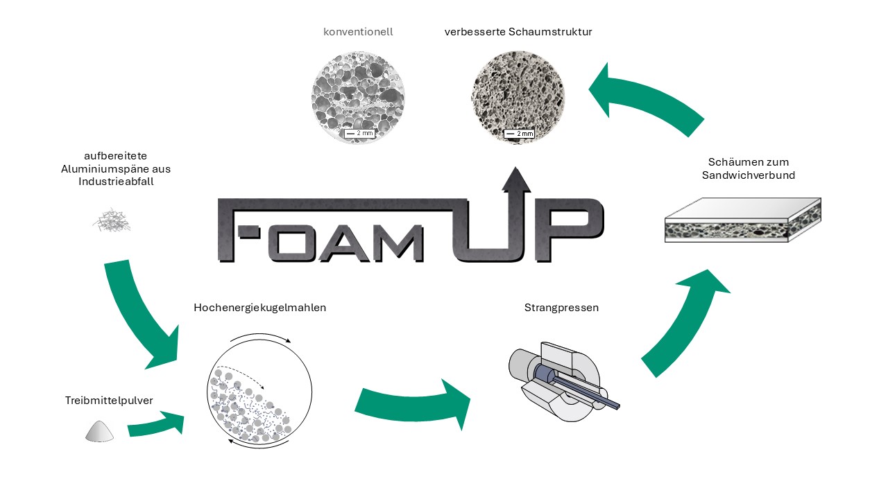 Im Rahmen des für zwei Jahre geförderten Projektes „FoamUP“ untersuchen die TU Chemnitz gemeinsam mit dem Fraunhofer IWU die Herstellung pulvermetallurgischer Aluminiumschäume auf Basis der Nutzung von Produktionsabfällen, die in sächsischen aluminiumverarbeitenden Betrieben anfallen. Neben diesem Ansatz, kostengünstiges Material wie Al-Späne einzusetzen, sollen auch neue effektive Heizkonzepte zum Schäumvorgang von Sandwichwerkstoffen entwickelt und erprobt werden.