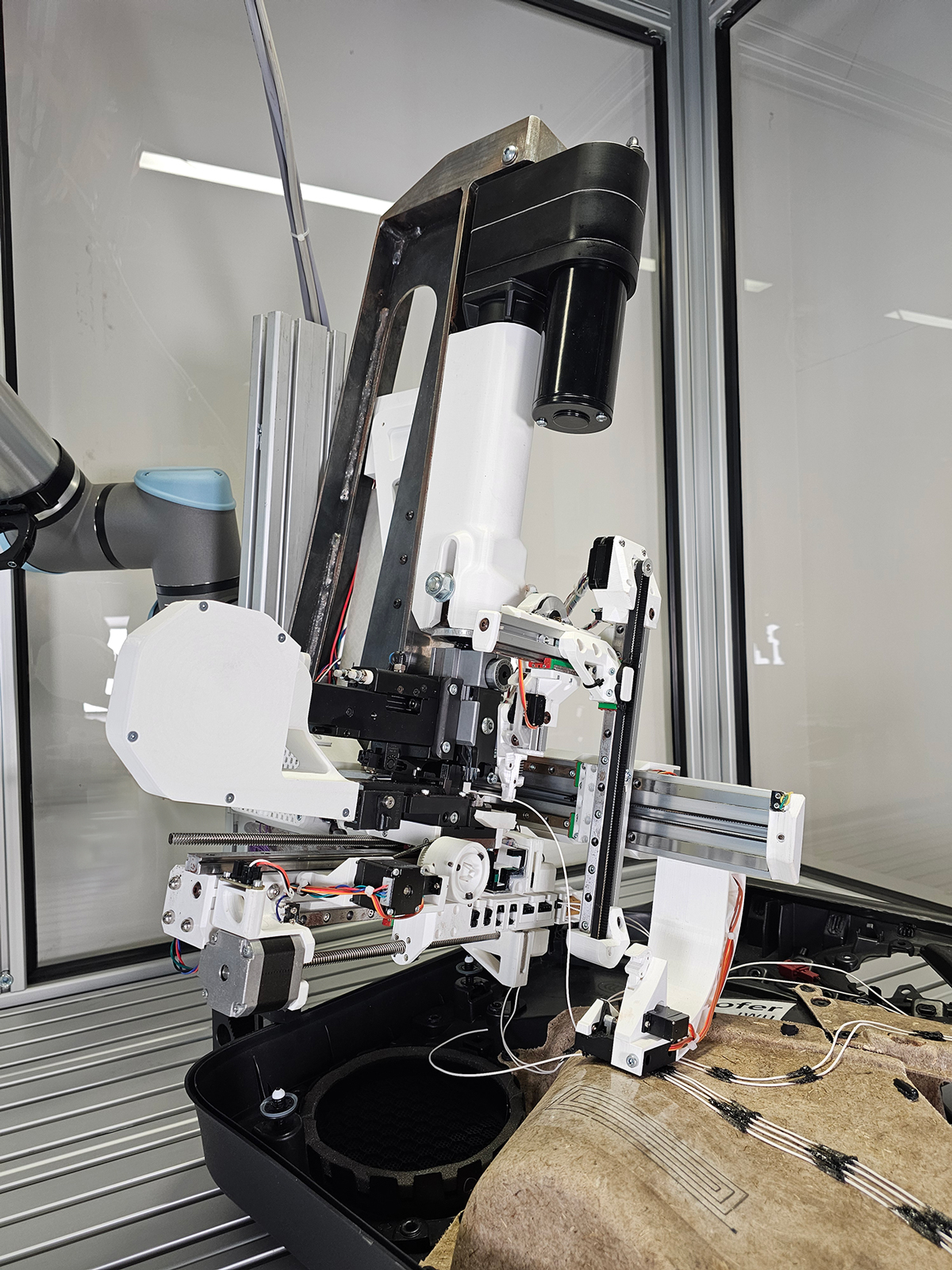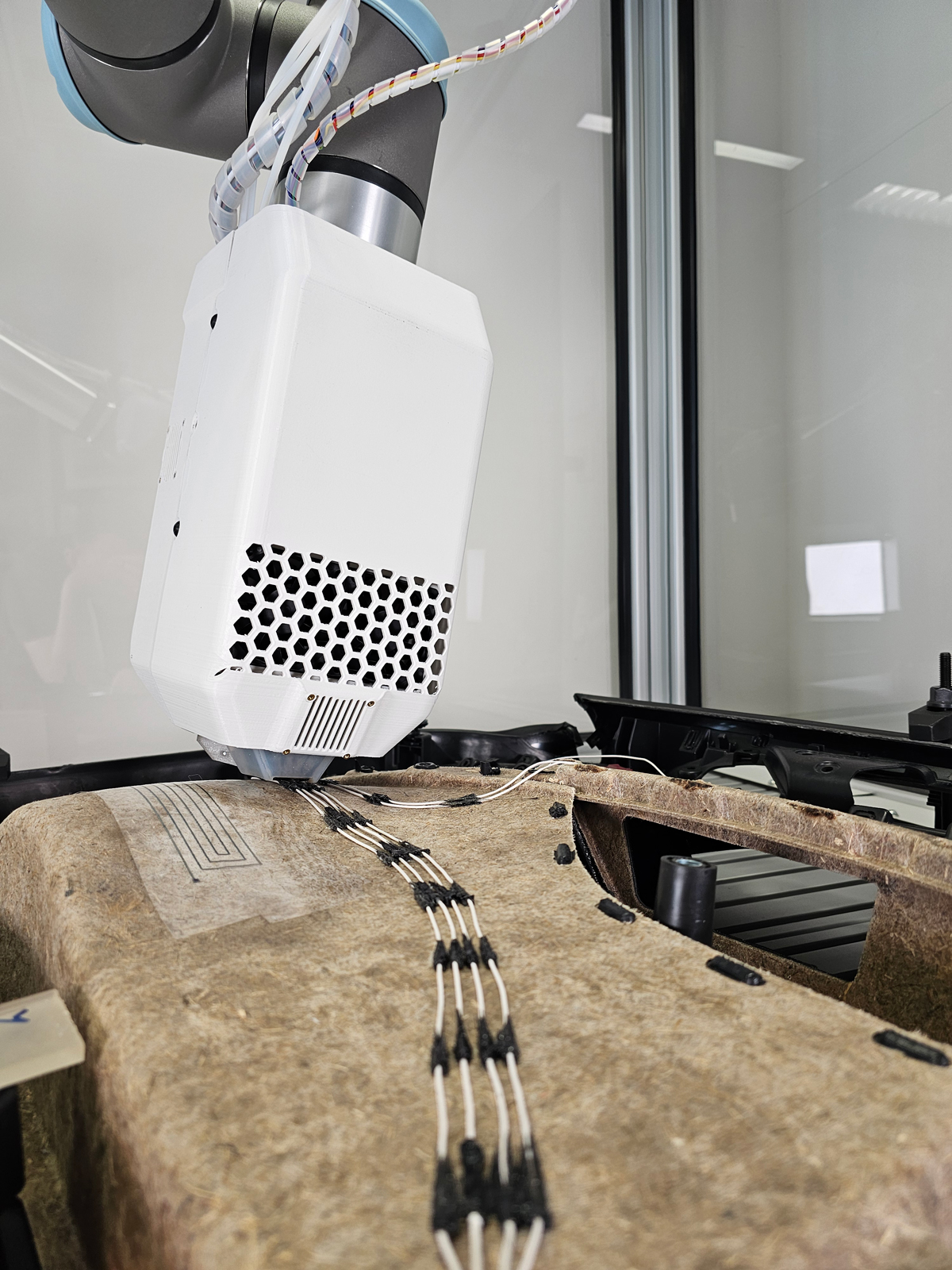 Handling and automated assembly of a wiring harness consisting of multiple cables with different lengths, cross-sections, and end contacts is extremely difficult for a robotic system to manage. For this reason, solutions typically involve a significant amount of cameras, software, and processing. In the AuCA system, cable laying has been completely rethought and combined with 3D printing technology, so that the flexible cables no longer need to be "gripped" but are laid from an endless reservoir